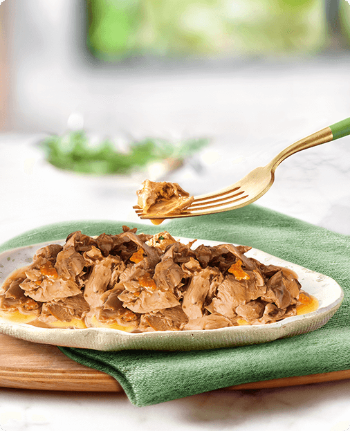 Състав: Месо и месни субпродукти (от които говеждо 14%), растителни протеинови екстракти, риба и рибни субпродукти, Зеленчуци (0,9% дехидратиран грах, еквивалентен на 9,1% грах; 0,5% дехидратирани моркови, еквивалентни на 4,5% моркови), Минерали, Продукти с растителен произход, Захари.