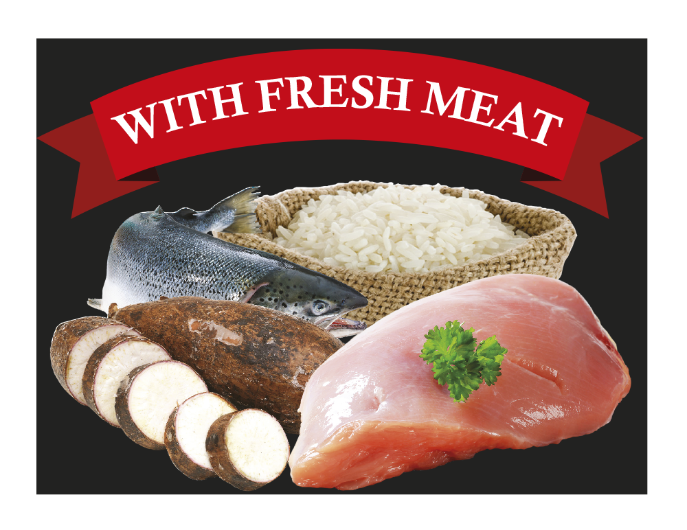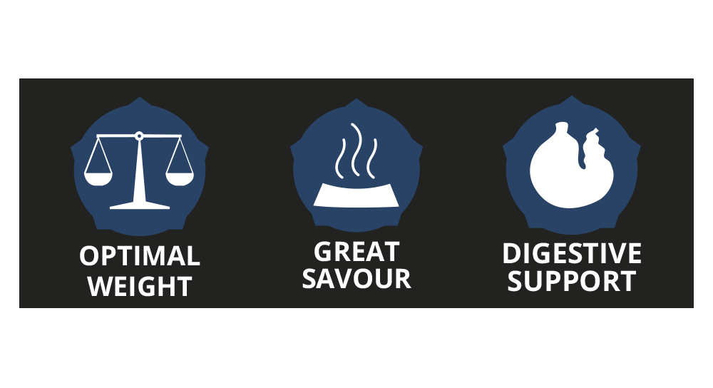 Състав: дехидратирано птиче месо (25%), ориз (23%), царевица, пресни домашни птици (10%), животински мазнини, фруктоолигозахариди – FOS, целулоза, сушена цикория, масло от сьомга, дрождеви екстракти, растения (псилиум, розмарин, невен, куркума), юка шидигера.
