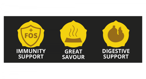 Състав: дехидратирано птиче месо (32%), ориз (28%), прясно пилешко месо (12%), царевица, животински мазнини, фруктоолигозахариди – FOS, сушена пулпа от цикория, масло от сьомга, пивна мая, екстракти от билки (псилиум, невен, куркума), Юка Шидигера.